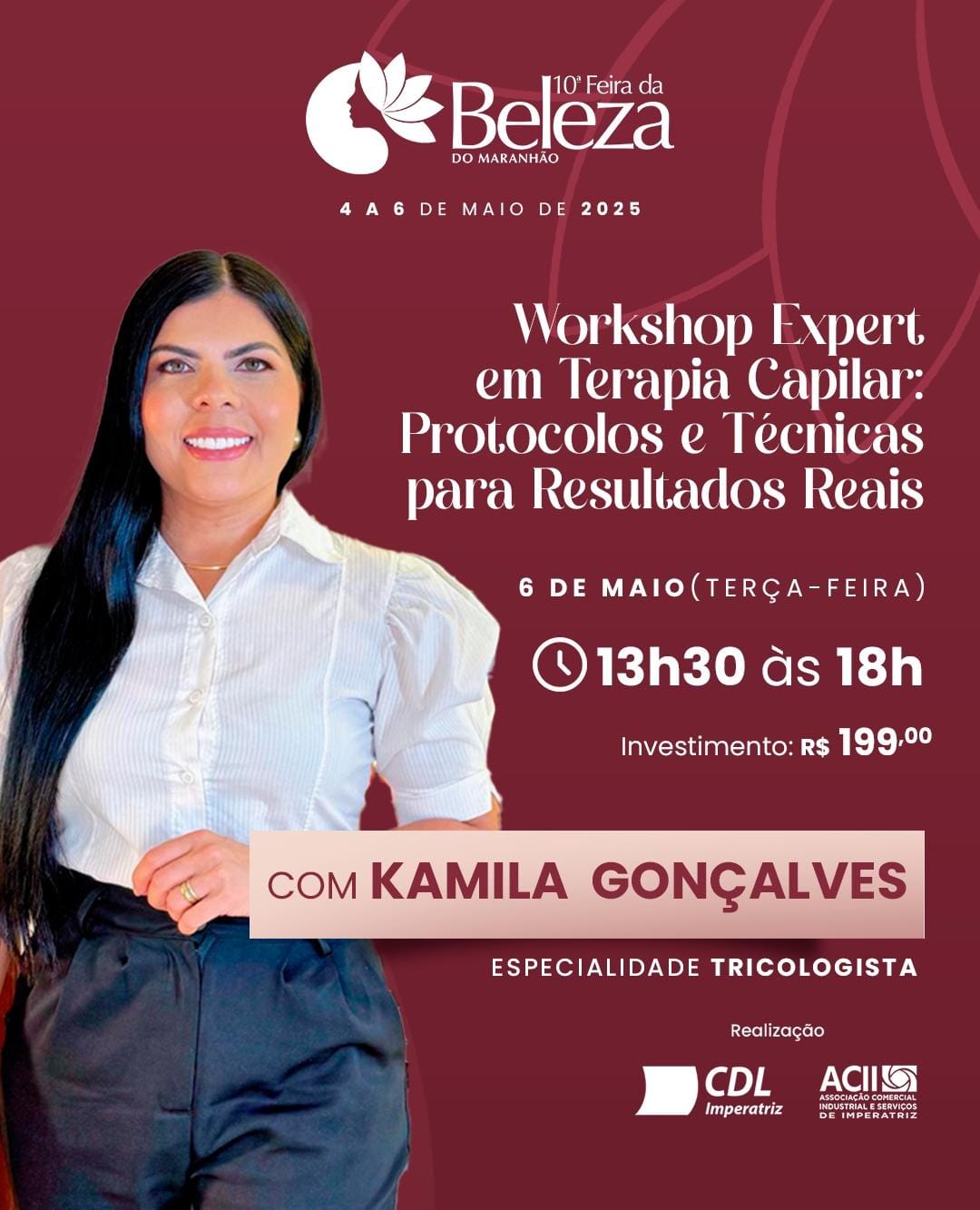Workshop EXPERT EM TERAPIA CAPILAR com Kamila Gonçalves Tricologista 13:30 às 18h